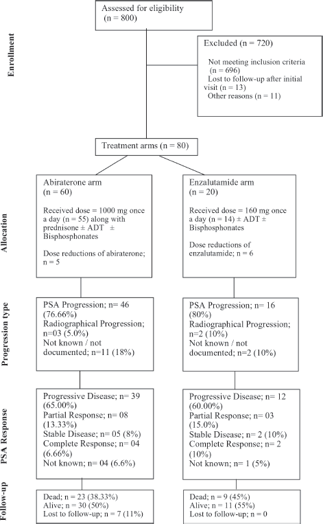 We employed a non-probability purposive sampling methodology for patient selection. We chose a non-probability purposive sampling methodology to ensure that our study focused on a specific subset of prostate cancer patients who met our inclusion criteria. Although all prostate cancer patients were considered, only those treated with first-line abiraterone or enzalutamide were included in the final analysis. This approach allowed us to comprehensively analyze the outcomes of these specific treatments in a real-world setting. Patients with a) other coexistent or historical malignancies, b) predominant neuroendocrine prostate cancer pathology and c) patients who were treated with either ADT alone or other hormonal agents or received systemic chemotherapy upfront; were excluded from the study analysis. Patients with metastatic prostate cancer who were treated with either first-line abiraterone or enzalutamide with or without ADT were included. Of the 800 patient files reviewed, 80 fulfilled our study inclusion criteria and were selected for further analysis (Figure 1).