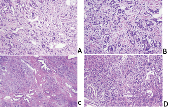 Low (C and D) and high power (A and B) images show prostate parenchyma involved by a neoplastic lesion exhibiting glandular crowding and infiltrative growth pattern. Individual neoplastic cells show nuclear enlargement and nucleolar prominence.