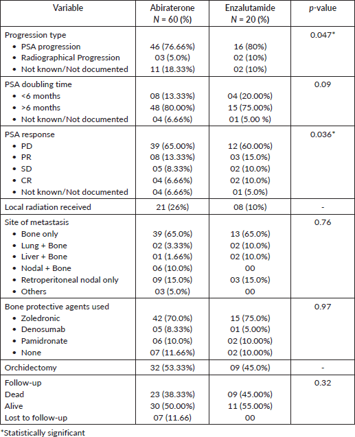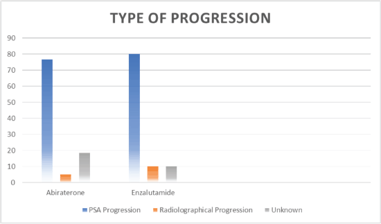 Out of 80 patients who fulfilled the study criteria, 60 (75%) patients were treated with abiraterone and 20 (25%) patients were treated with enzalutamide (Figure 1). Progression types were primarily characterised by PSA progression (76.66% with abiraterone versus 80.0% with enzalutamide) and radiographical progression with stable PSA (5% with abiraterone versus 10% with enzalutamide) (p = 0.047) (Figure 3 and Table 3). Patients with PSA progression, were later followed by imaging studies and showed radiographical progression as well.