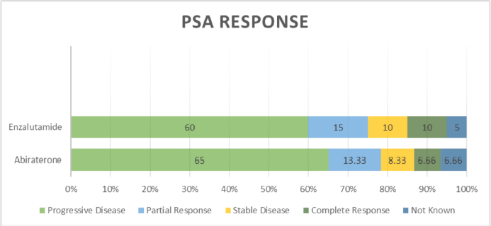 PSA response rates varied, with both drugs (abiraterone and enzalutamide) showing similar proportions of PD (60% versus 65%), PR (13.33% versus 15%), SD (8.33% versus 10.0%) and CR (6.66% versus 10.0%) (p = 0.036) (Table 2 and Figure 4). Follow-up data of available patients showed that patients who progressed were switched to either alternate hormonal agents or systemic chemotherapy (docetaxel), with 4 (5%) being transferred to palliative services with best supportive care only. Approximately half of the patients in the entire cohort were alive at the time of the last follow-up.