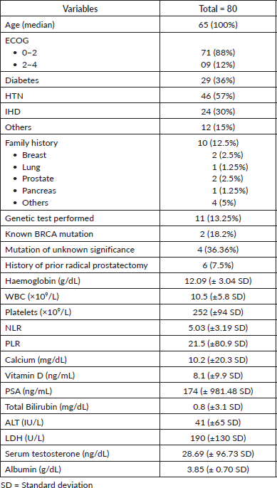 In our final analysis, 80 patients were evaluated. The median age was 65 years and most patients had an ECOG performance status between 0 and 2, accounting for 88% of the cohort, while a smaller subset displayed a status of 2–4. The group was characterised by a high prevalence of comorbid conditions, with diabetes mellitus present in 36%, hypertension (HTN) in 57% and ischemic heart disease (IHD) in 30%. The patients reported a diverse familial cancer history, with incidences of patients with a positive family history at 12.5%. Genetic testing was conducted on 13.25% of the patient population. Among these, two patients tested positive for the BRCA gene mutation and four patients were found to have mutations of unknown significance (Table 1).