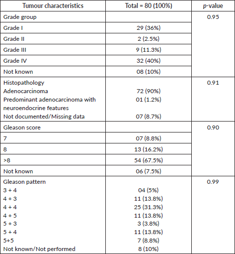 Tumour characteristics were also evaluated. Histopathology predominantly showed adenocarcinoma, representing 91% of cases, with a minor proportion exhibiting predominant adenocarcinoma with neuroendocrine features (1.2%) (Figure 2). The patient’s haematological and biochemical baseline parameters, tumour grading and further characteristics are shown in Tables 1 and 2. The PSA in the entire cohort ranged from 0.07 to 3,400 ng/mL with a mean PSA of 174 (± 981.48 SD). The majority of the patients (51.3%) had Grade Group III–IV disease with a Gleason score of >8 was found in 67.5% of the population. Forty-one (51.25%) patients had undergone bilateral orchidectomy. The median time of GnRH analogue use was 32 months. Most of the patients (72.5%) were castration sensitive.